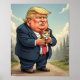 A funny cartoon of Donald Trump standing and holding a kitten in his hands.