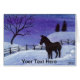 A tiny watercolor landscape of a donkey in a snowy field silhouetted against and a starry, night sky.