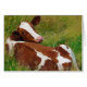 A cute young steer calf lazily lounges on a green pasture to chew its cud, and turns its blocky head back to see who or what has disturbed him. This was a colour photograph of a brown and white coloured holstein or fresian dairy cow, digitally enhanced with brush stroke detail to resemble a painting.
