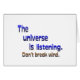 This funny slogan reminds you that even though that fart you just slipped out was supposed to be of the silent but deadly variety there is something that always knows when you pass gas, no matter how discreet you are. The text of the graphic says: ' The Universe is Listening. Don't break wind.' The colours of the words are blue and orange.