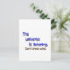 This funny slogan reminds you that even though that fart you just slipped out was supposed to be of the silent but deadly variety there is something that always knows when you pass gas, no matter how discreet you are. The text of the graphic says: ' The Universe is Listening. Don't break wind.' The colours of the words are blue and orange.