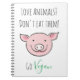 This Vegan notebook features a smiling cartoon pig face on a white background. The texts say: "Love animals? Don't eat them", and "Go Vegan".