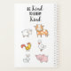 The back presents six fun cartoon farm animals (sheep, cow, rooster, goose, rabbit, and pig) on a white background, with the text "Be kind to every kind" in black on the top.