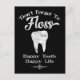 A fun chalkboard dental themed image with a big white tooth and the message "Don't forget to floss, happy teeth, happy life" in black and white.