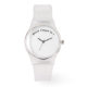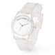 I only have one complaint. I ordered the watch with clear case and strap, and what was sent was white case and strap. I'm going to keep it because 1) it looks very nice in white, and 2) it would take too long to get a replacement made and sent in time for my occasion. Aside from the mix up with the color, the watch does look very good in white. The purple dial is actually sparkly which did not show in the online images. That was a nice surprise. If you like Swatch watches this is very similar to those. It's 33.6mm in diameter, 10.5mm thick, and 40.6mm lug to lug. Stainless steel case back says 3ATM/30m WR, so no swimming or showering or submerging this one. If you like Woodstock, this is a great choice.