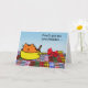 Don't get too comfortable ... Older orange cat sitting in a yellow pan with a red bow on the handle. Bright and colourful madras plaid fabric design below it. Light blue colours in the background. Funny verse inside. Cat/pan element courtesy of netrat/openclipart. ©Shoaff Ballanger Studios.