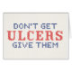 Don't get ulcers, give them! Fun advice stitched in retro cross stitch embroidery needlework on white Aida cloth background.