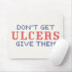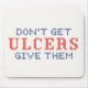 Don't get ulcers, give them! Fun advice stitched in retro cross stitch embroidery needlework on white Aida cloth background.