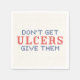Don't get ulcers, give them! Fun advice stitched in retro cross stitch embroidery needlework on white Aida cloth background.