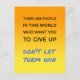 This is an inspirational postcard, with a quote to encourage you to think positively and be strong. "THERE ARE PEOPLE IN THIS WORLD WHO WANT YOU TO GIVE UP. DON'T LET THEM WIN". The text is in black and blue, on a bright yellow and orange background.