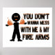 A fun play on words. No one messes with my flaming, I mean FIRE, arms. You never know just who may get hurt, including myself! So don't mess with me!