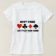 If you've ever played the game of bridge and wound up in the wrong contract, you'll enjoy this sound bridge advice tee featuring the four card suits and the saying "Don't Panic Just Play Your Hand". Make others do a double-take with respect to your wry sense of bridge humour with this bridge attitude tee!