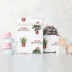 Pattern with illustrations of house plants in santa suit pots decorated with Christmas ornaments, Christmas lights, and santa hat. Text says, "Don't stop Be-leaf-ing."
