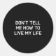 Don't Tell Me How To Live My Life, Funny, Sarcasti Classic Round Sticker