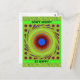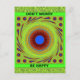 The image prominently features the uplifting phrases "DON'T WORRY" at the top and "BE HAPPY" at the bottom. At the centre lies a vibrant, circular kaleidoscopic pattern, framed by a bold green square adorned with small blue circles at each corner. The entire design is set against a bright green, textured background, creating a balanced and centred composition that draws the eye.