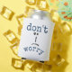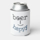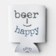 "Don't Worry Beer Happy" is set on the front and back of this can cooler in two parts. Set in a simple typewriter font, a text style emoji is added for fun. On the bottom of the cooler is a cheeky wink emoji and a place to add your name. Colours are blue and grey text on white.