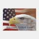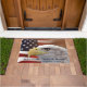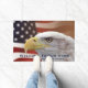 Doormat shown is a very large face of an American Bald Eagle superimposed in front of the American Stars and Stripes U.S. Flag. Text beneath eagles head is shown in Navy Blue and reads "Welcome To Our Home" with subtext of " Land Of The Free And Home Of The Brave". A perfect patriotic decoration to welcome guests to your home or used inside your home office.