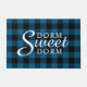Unique, elegant and decorative modern farmhouse style doormat with cute Dorm Sweet Dorm quote text, on a classy blue and black coloured Buffalo Lumberjack tartan checks pattern design.