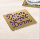 This is a Dorm Sweet Dorm coaster set. The coasters feature the words Dorm Sweet Dorm in purple script on a metallic gold background. There are two cute purple hearts between the words. The art is a cute comic vector art style. The coasters are paper pulp coasters in a six coaster set. The coasters are tough, durable, absorbent and great for parties, dorms or home use. The dimensions are 4" by 4".