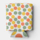 This can cooler has a geometric design of dots in coral, gold, and sage green.