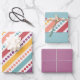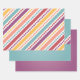 Cheerful rainbow colours in the form of dots and stripes bring a happy vibe to any party. This girl-themed birthday wrapping paper set features multiple coloured stripes and dots that alternate between burnt orange, golden yellow, seafoam blue, purple, and peach. The stripes and dots are placed diagonally across the paper on the first sheet. The second sheet features a seafoam blue gradient background with a band of dots and stripes across the middle. The third sheet has a purple gradient background.