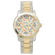 This men's watch has a geometric design of dots in coral, gold, and sage green.