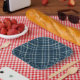 Dotted checkered pattern. Gray-blue background.