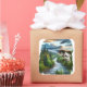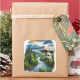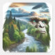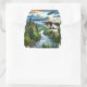 Stickers with Bigfoot with a double exposure of trees, a river, clouds and a forest surrounded by negative space.
