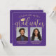It's a double graduation party! Announce the achievement of two graduates and invite family and friends to celebrate with stylish joint graduation party square photo invitations. All pictures and wording are simple to personalise, and the colours can be customised using the Zazzle design tool. (IMAGE PLACEMENT TIP: An easy way to position a photo exactly how you want is to crop it before uploading to the Zazzle website.) This template is a combination announcement card on the front with the grad party invitation on the back. The modern purple and gold design features handwritten style script calligraphy with a mortar board cap, elegant classic typography, and 2 photos of your choice, such as senior pictures or images from the commencement ceremony. Please note that gold is printed colour, not metallic foil. This graduation invitation card is a stylish way to announce a special day celebration for any two grads, such as siblings, best friends, cousins, twins, brother and sister, etc. Congratulations to both of the graduates!