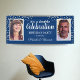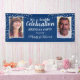 Elegant joint birthday party banner featuring a stylish blue background that can be changed to any colour, 2 photos, a scattering of party silver confetti glitter, and a modern double celebration template that is easy to personalise.