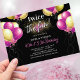 Pink & gold joint birthday invitations featuring a stylish black background, glittery party balloons, and a "twice the fun" text template that is easy to personalise.