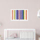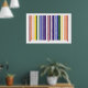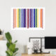 Geometric barcode design features two rainbows made of pairs of coloured stripes that correspond to UPC numbers. Getting my geek on, the numbers correspond to the letters in "rainbow" to make a double rainbow. Since barcodes are only 12 numbers long, I let the "r" be represented by the red start and middle stripes. The sequence starts on the left with red, orange, yellow, green, blue, indigo, and violet. Two stripes of red serve as a divider in the middle and then the colours go from violet back to red for a balanced look.