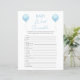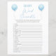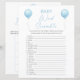 This double sided game card features word scramble on the front and bingo on the back, and is perfect for a baby shower or baby sprinkle. This word scramble bingo game features a blue watercolor balloon. You can personalise this design by clicking on "Personalise this template" or if you wish to change the font, colours or arrange the design elements in a different way you can click on "Edit using Design Tool". Answer Key: 1. Diaper 2. Bassinet 3. Bottle 4. Crib 5. Pacifier 6. Changing Table 7. Stuffed Animal 8. Stroller 9. Rubber Ducky 10. Blanket 11. Teether 12. Formula 13. High Chair 14. Mobile 15. Thermometer 16. Baby 17. Milk 18. Booties 19. One-sie 20. Teddy Bear
