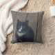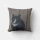 Throw pillow with two original photographs on either side of cats one side has a back and white cat and the other side has a grey tabby in the snow