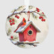 A beautiful double=sided Christmas ornament. Each side has a pretty illustration of cardinals. One on a bird house and the other on a pretty snow covered pine branch with red berries.