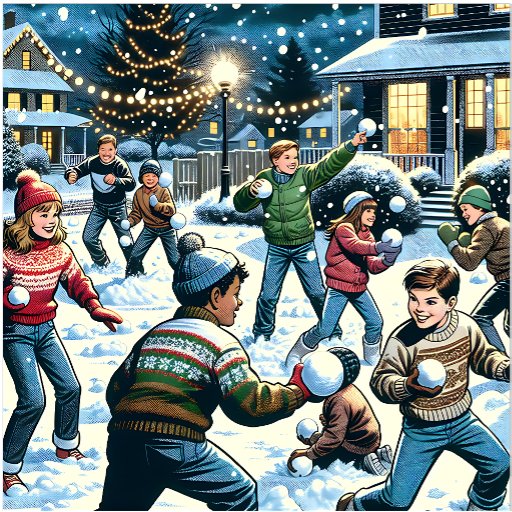 Holiday winter themed scrapbook paper. A cute winter scene done in a comic book style with kids having a snowball fight in the front yard. Hoping to provoke a nostalgic feelign with this art.