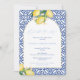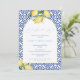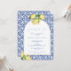 Trendy watercolor lemons and glossy green leaves with a cobalt blue and white vintage tile design this modern baby shower invite design.
