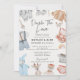 A unique design for girl & boy twins for a VIRTUAL shower, featuring an illustration set of baby clothes, shoes, toys and, rainbows in modern subtle colours including blue, pink, light red, grey, brown. Personalise your template front and back. Do you need extra pieces that are not in the collection? Please contact me (Maria) using the contact button below. Happy to help!