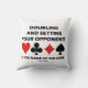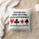 Bridge players who know what the game of bridge / duplicate bridge is all about will enjoy this throw pillow featuring the four card suits along with the following explanation of the game of the bridge: "Doubling And Setting Your Opponents Is The Name Of The Game". Make others do a double-take with your explanation of what the game of bridge is all about with this tongue-in-cheek bridge humour throw pillow!