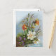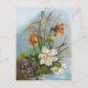 A floral, Victorian trade card with purple violets and double white and yellow daffodils and grasses by the side of a pond.