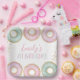 Cute Doughnut Birthday personalised paper plates. Our hand drawn pink, purple and aqua doughnuts with faux gold glitter and faux gold flakes are super cute and make this the perfect theme for your little ones Doughnut Grow Up 1st birthday party.