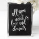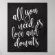 An elegant cutting edge wedding sign, features the text "All you need is love and doughnuts" in a extroverted script font, the brush texture adds a spontaneous and playful feeling. The background colour can personalised according to your needs and preferences, please contact me if you have any special request.