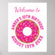 Doughnut Birthday party theme cute welcome poster sign. Fun colourful template with sprinkled doughnut drawing. Cheerful design for children's celebration.