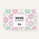 Name tag with a deliciously fun pattern. Illustration of pastel pink and green doughnuts with sprinkles and icing.