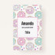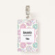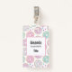 Name tag with a deliciously fun pattern. Illustration of pastel pink and green doughnuts with sprinkles and icing.