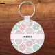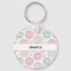 A keychain with a deliciously fun pattern. Illustration of pastel pink and green doughnuts with sprinkles and icing.