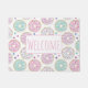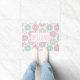 Welcome doormat with a deliciously fun pattern. Illustration of pastel pink and green doughnuts with sprinkles and icing.