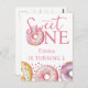 A 1st birthday party invitation to mark your little girl's first milestone birthday. The invitation is dessert themed featuring a yummy watercolor sprinkle pink doughnut/doughnuts. The message reads 'Sweet one' in keeping with the dessert themed invitation. This invitation can be personalised with the inclusion of your little one's party details. The design is cute, modern and sweet.