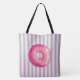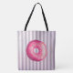 All over print tote bag with a yummy illustration of a pink frosted doughnut with colourful sprinkles. Set on a shabby vintage style pattern with pastel purple and pink stripes.