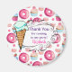 A cute customised birthday party thank you magnet. A yummy with a delicious pattern design. Glazed pink doughnuts with sprinkles. Mouth watering cupcakes in pink and blue with rosettes and strawberries on top. Some pastel pink french pastry macarons and little pink candy buttons also decorate this pattern full of sweet treats. A whimsical frame in a hand drawn style in the centre for you to personalise with your name. With a mint green ice cream cone off to the side